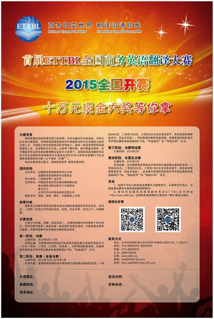 首届全国商务英语翻译大赛(ETTBL)由全国商务英语翻译考试办公室、全国商务英语翻译专业委员会主办的全国性商务英语赛事。比赛分三个阶段:校级初赛、省级复赛、全国决赛预选赛和总决赛。总决赛设一等奖、二等奖、三等奖、优秀奖若干,获奖者将颁发荣誉证书、奖金及奖品。为备战省级复赛及全国决赛,必赢官网决定举办2015年首届全国商务英语翻译大赛(ETTBL)初赛。现就比赛相关情况说明如下: