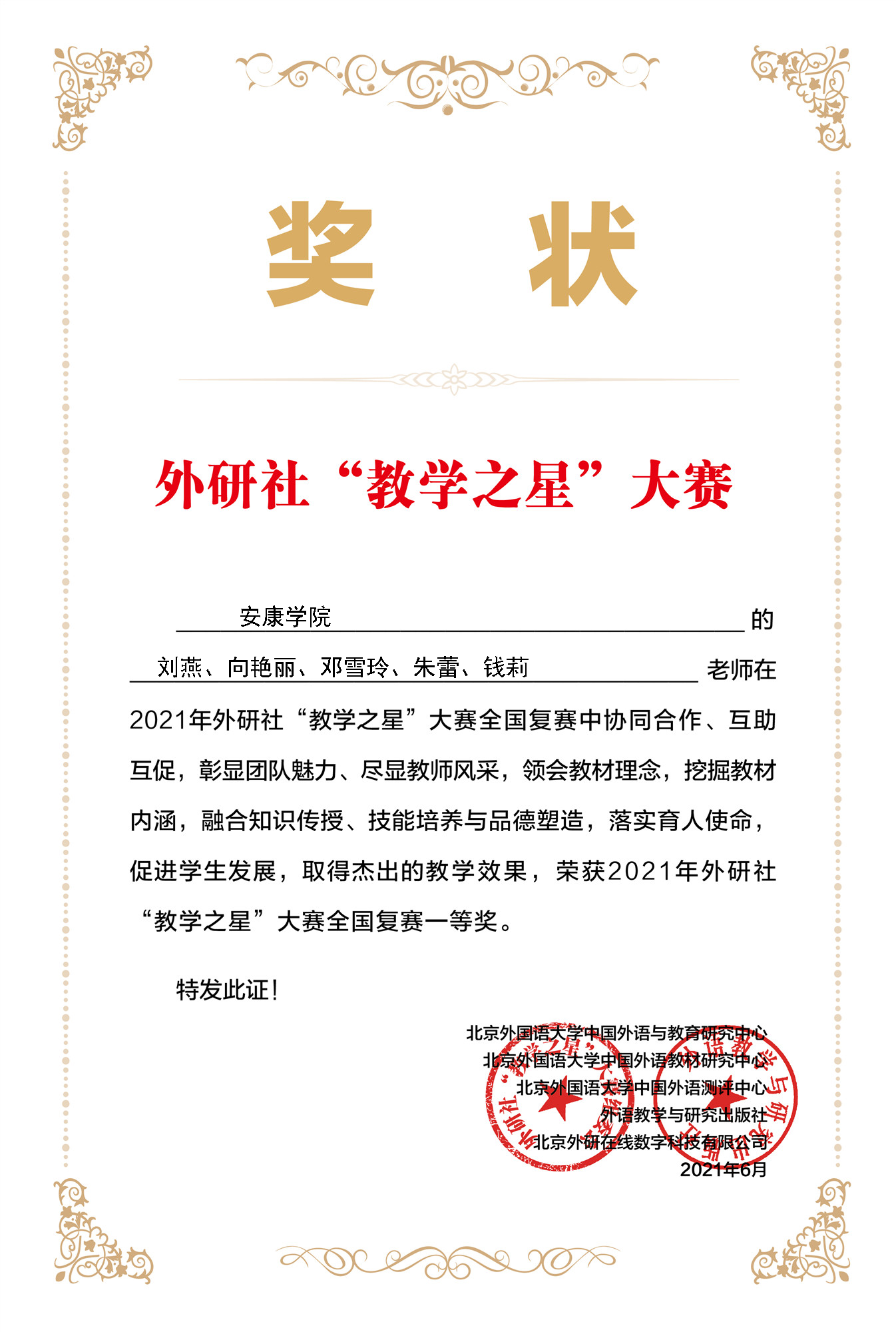 近日,2021年外研社“教学之星”大赛全国复赛结果揭晓。由必赢官网必赢242net官网教师刘燕、向艳丽、邓雪玲、朱蕾、钱莉组成的大学英语教学团队在全国复赛395个参赛团队中脱颖而出,荣获本届大赛大学英语组全国复赛一等奖。