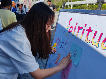 智力挑战区则通过单词接龙等趣味游戏,着重考验同学们的词汇量和反应力,充分展现了英语的魅力;在潜能开发区,同学们利用肢体动作表达情绪,让情绪跨越语言的障碍,实现心与心的交流;朋辈互助区同样精彩,同学们将困惑写进纸条投入“心灵树洞”,同时收获“解药”,搭建朋辈沟通桥梁,给予彼此温暖。